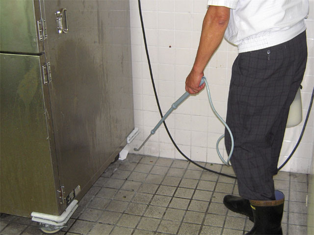 施工内容は、1ヶ月2回施工でMC乳剤散布、ベイト剤(生毒エサ)を什器等ゴキブリが徘徊する経路に注入すると同時に、持続性の高い毒エサがケースに入った箱も設置致します。